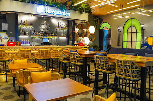 Hoegaarden Bar is is a welcoming spot for travelers to relax before their flight,offering a variety of alcoholic beverages and food items.